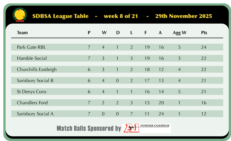 Park Gate take the advantage going into the second round of fixtures after inflicting Sarisbury A's 7th straight defeat, Hamble are still in second despite a 4-2 loss at Sarisbury B and St Denys drew with Chandlers Ford to remain well placed with a game in hand.