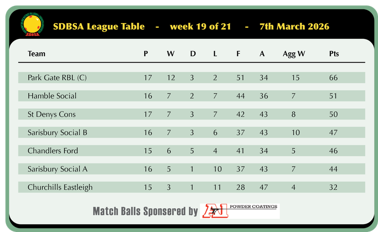 Park Gate just need 5 points from their last 2 games to secure the title after a 5-1 win against the closest challengers St Denys, Chandlers Ford are the only other realistic chasers with 4 games still to play after a 3-3 draw against Sarisbury B and Hamble move into second place after inflicting a 6-0 defeat on bottom club Churchills.