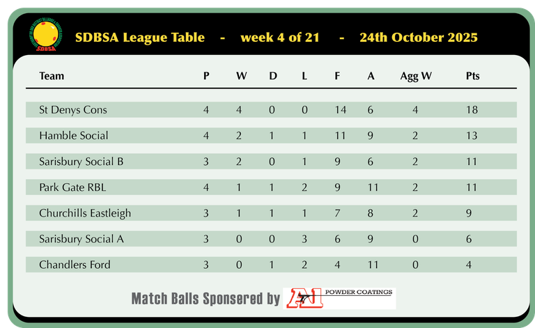 St Deny Cons still hold a 5 point advantage at the top after yet another win as they beat Park Gate 4-2, Hamble Social are still the main challengers after registering a 4-2 win of their own away at Churchills and Chandlers Ford's return is still stuttering as they conceded 5 away to Sarisbury B.