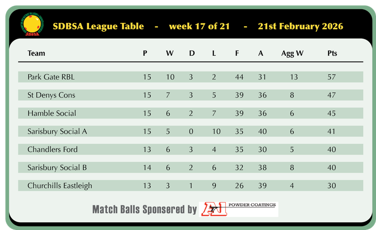 Park Gate again won 5-1 against Sarisbury B to leave little doubt about their title credentials, closest rivals St Denys faultered by the same scoreline away at Hamble social meaning St Denys are now 10 points adrift. At the other end, Sarisbury A dealt more misery on Churchills by beating them 5-1 to leave them rooted to the bottom.
