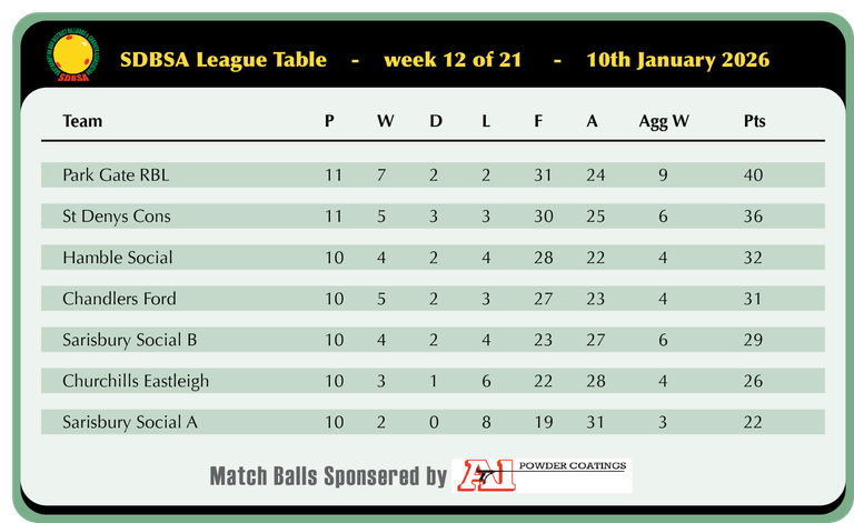Park Gate win 4-2 against struggling Churchills to maintain a healthy advantage, St Denys Cons are now the closest challengers having played out two 3-3 results against Sarisbury B and some first class breaks saw Chandlers overcome Sarisbury A 4-2.