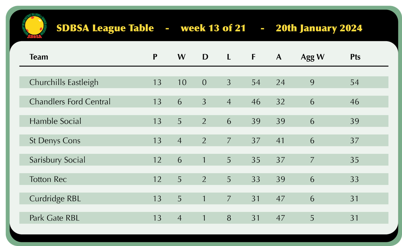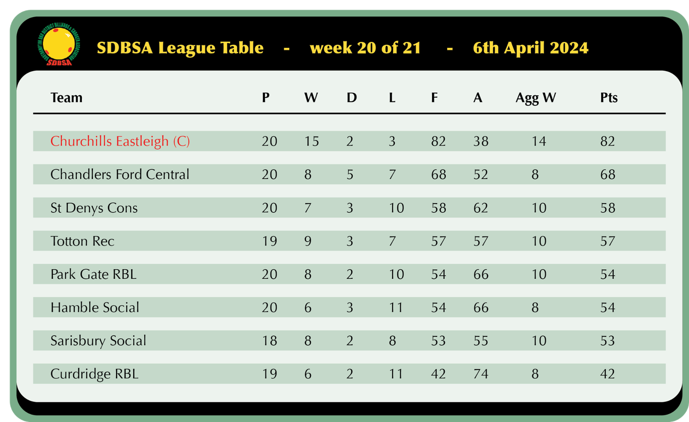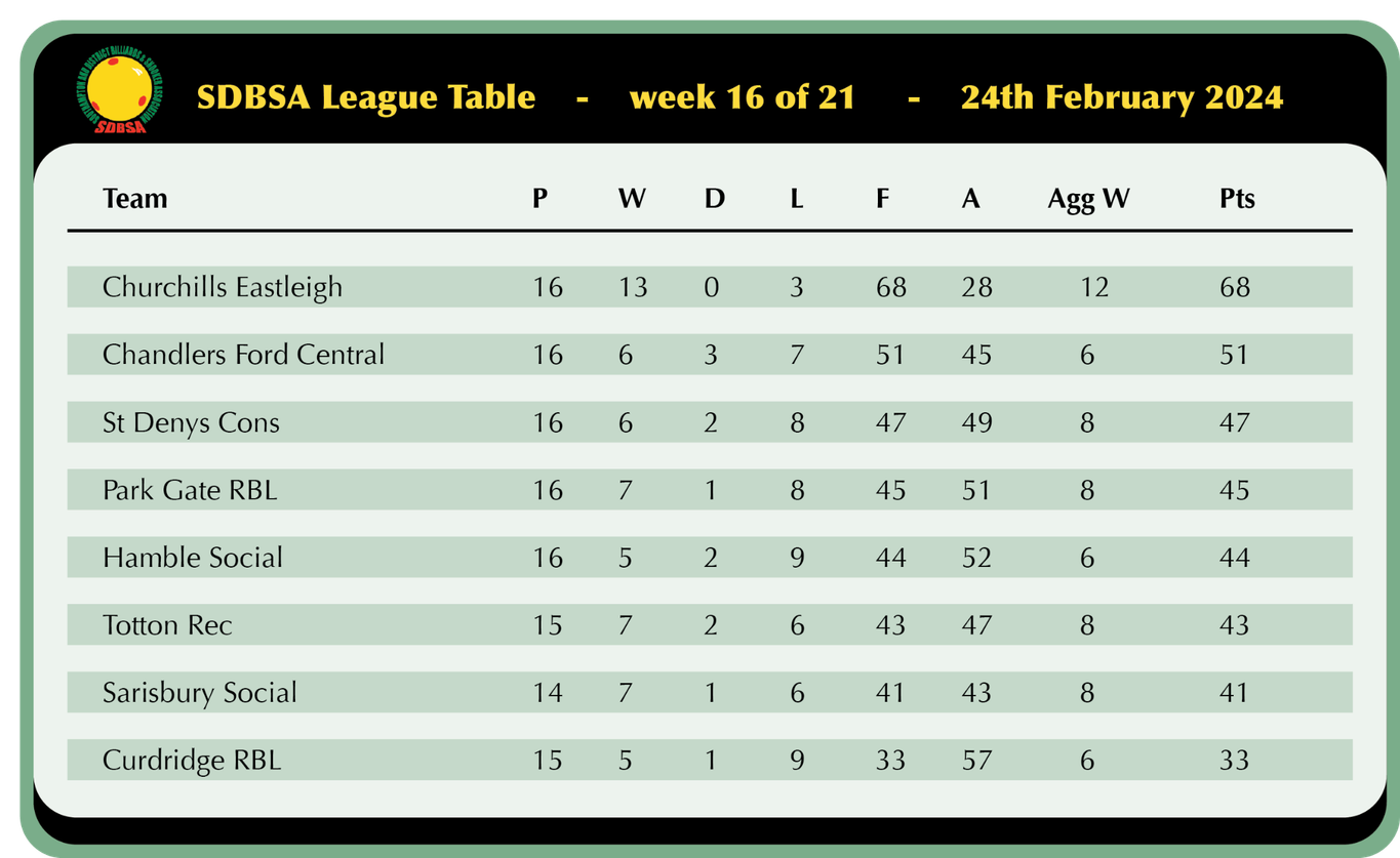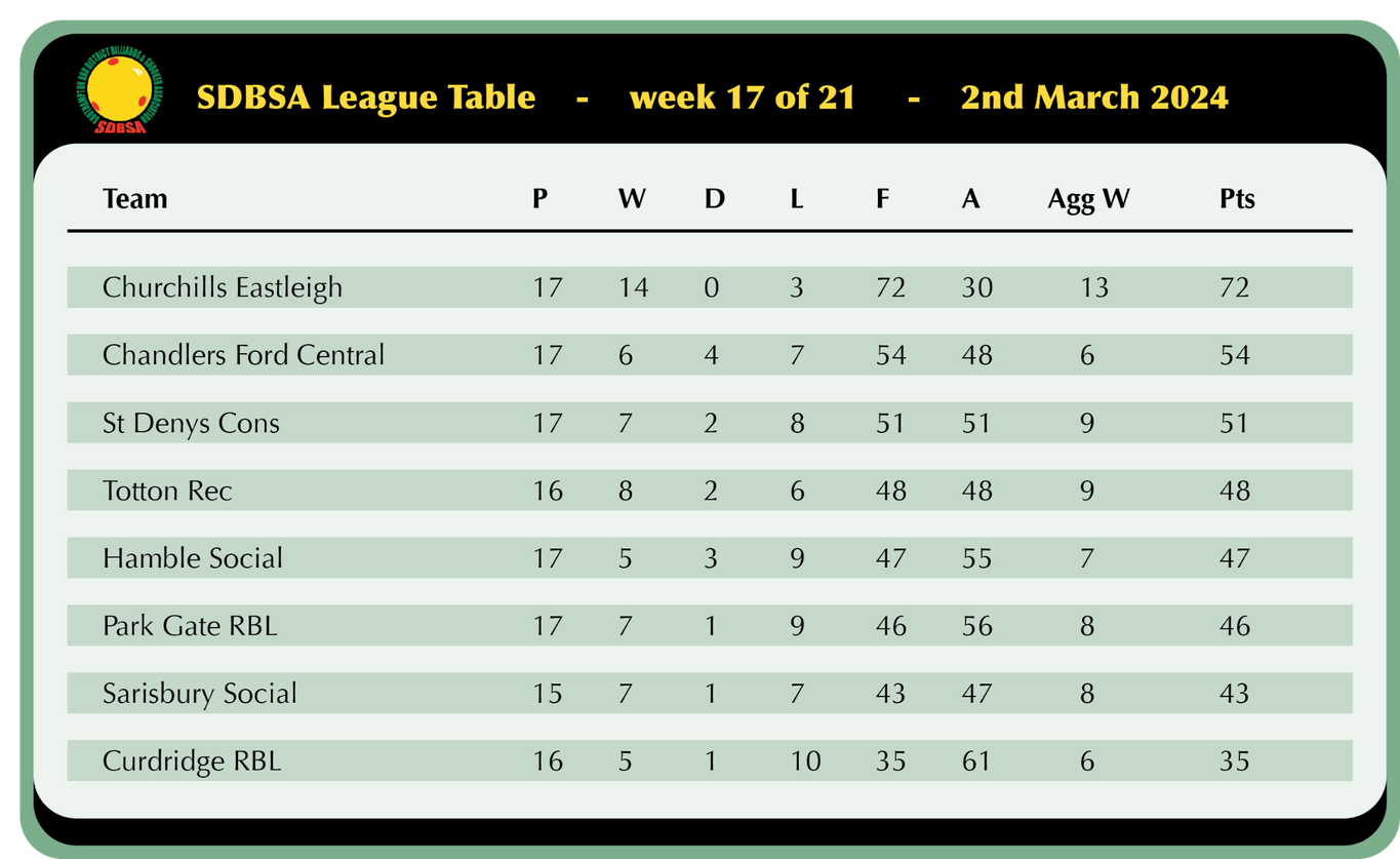 Sarisbury Social look to be making a late push for a top 4 finish as they won 5-1 away at Hamble and sit just 5 points off 3rd with 2 games in hand, Nick Wood registered a 45 break in his victory over Ian Pardey but that was as good as it got as Trevor Sanders, Geoff Knapp, Kaz Remzi and Chris Collison all secured solid wins in their captains absence.