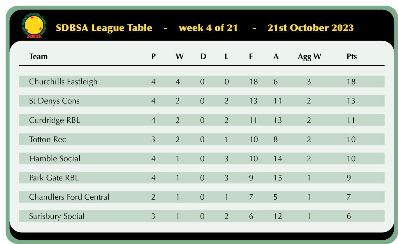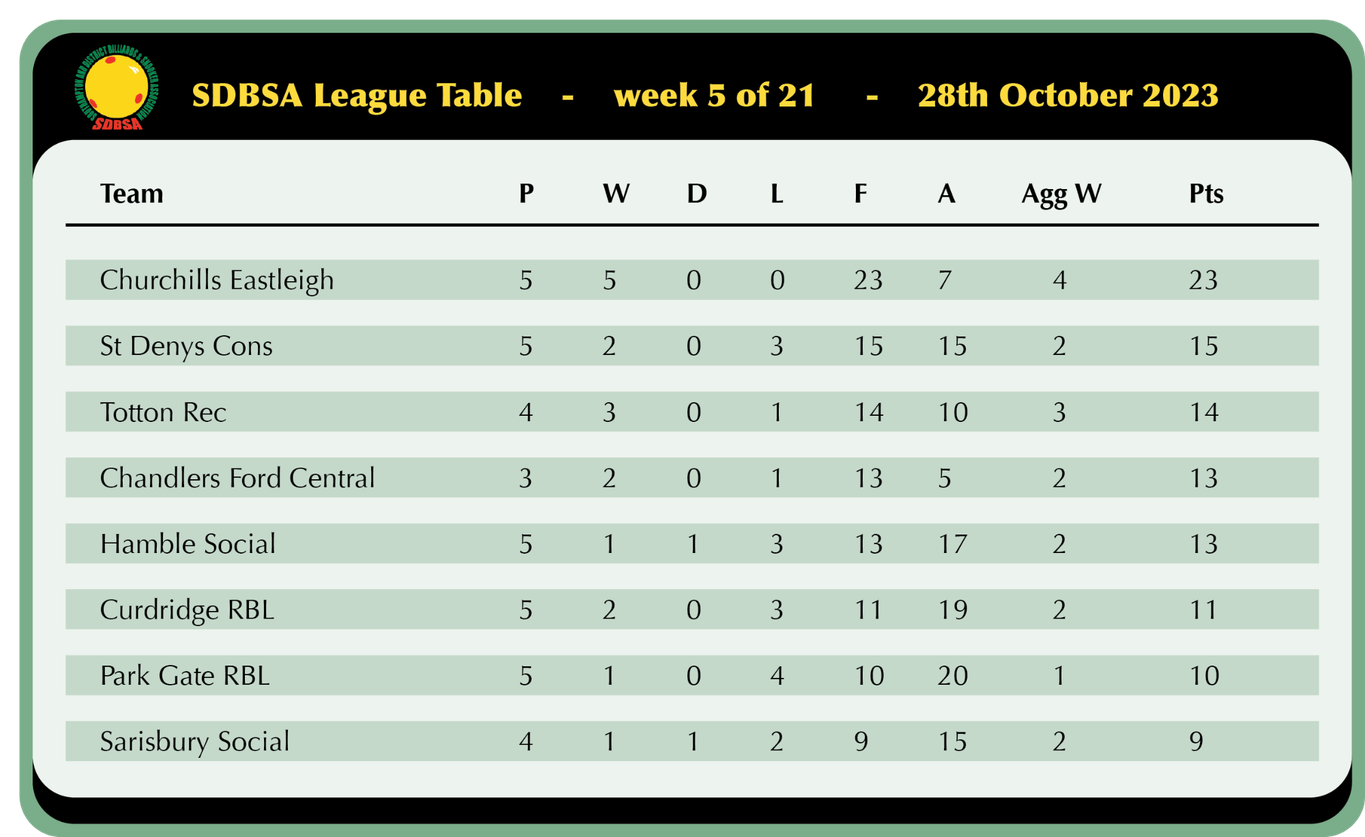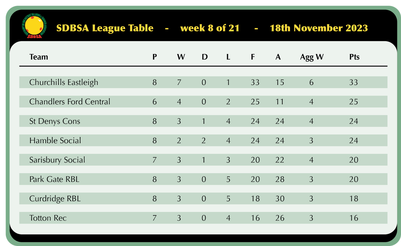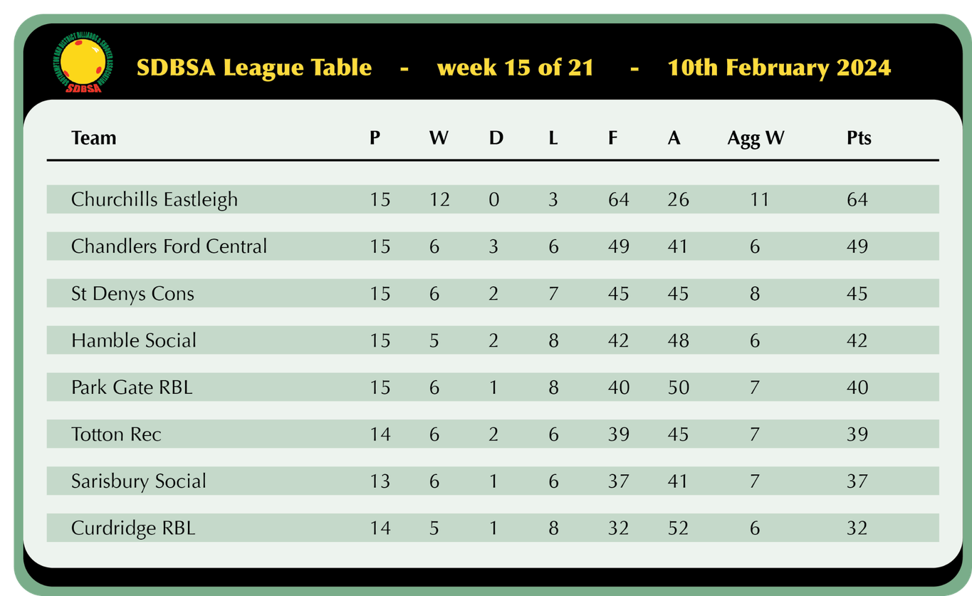 Sarisbury Social look to be making a late push for a top 4 finish as they won 5-1 away at Hamble and sit just 5 points off 3rd with 2 games in hand, Nick Wood registered a 45 break in his victory over Ian Pardey but that was as good as it got as Trevor Sanders, Geoff Knapp, Kaz Remzi and Chris Collison all secured solid wins in their captains absence.