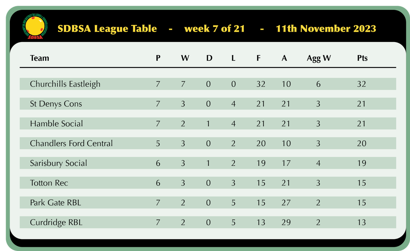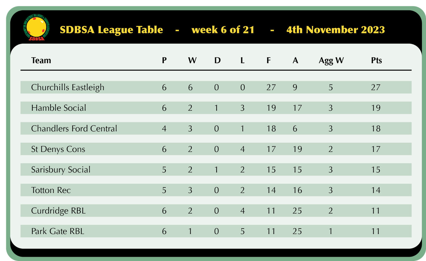 Churchills Eastleigh remain as the seasons other unbeaten side as they beat Hamble on their own tables 4-2, Steve Hughes was victorious once again to keep his winning run going, Steve last lost a game nearly a year ago against Hambles Nick Wood, Nick as it turns out was the only winner on the night for the home side running in a 41 break then finishing with a fine 65 unfinished to beat a returning Mike Henstredge, the 79 point win proving to be crucial for the aggregate point as although the match finished 1-4 to Churchills the 79 points was amazingly enough to earn Hamble the bonus point! Returning Captain Derek Foster won yet again with Steve Hulbert and Jerry Warren impressing yet again.