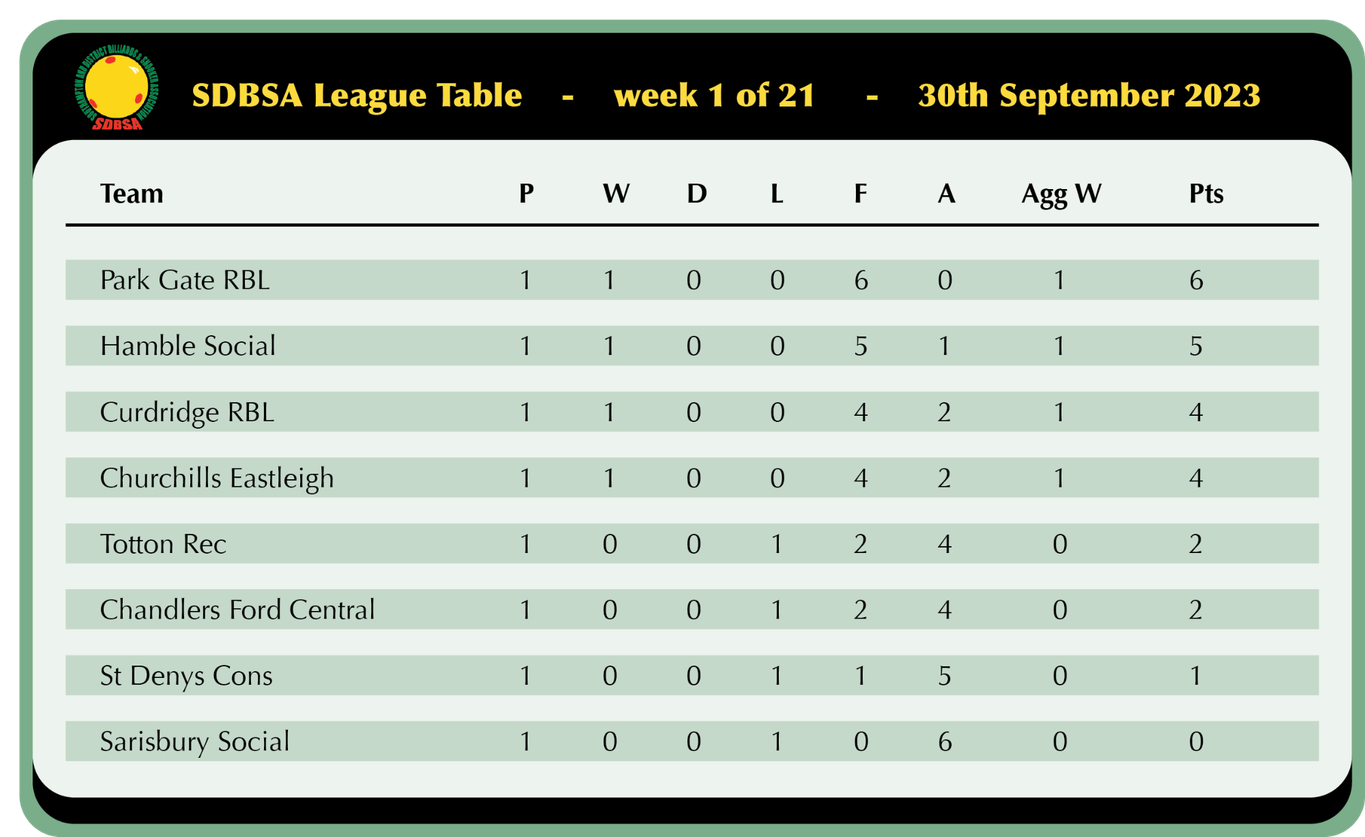 Stand-in captain Ian Finch (30 break) guided Park Gate to maximum points over Sarisbury Social, a rare outing for Paul Tavender who also shone with a 44 break put them 2-0 up with Steve Boterhoek, Chris Christodoulou and Gary Wilton supporting well to complete the maximum and take Park Gate top as the early leaders.
