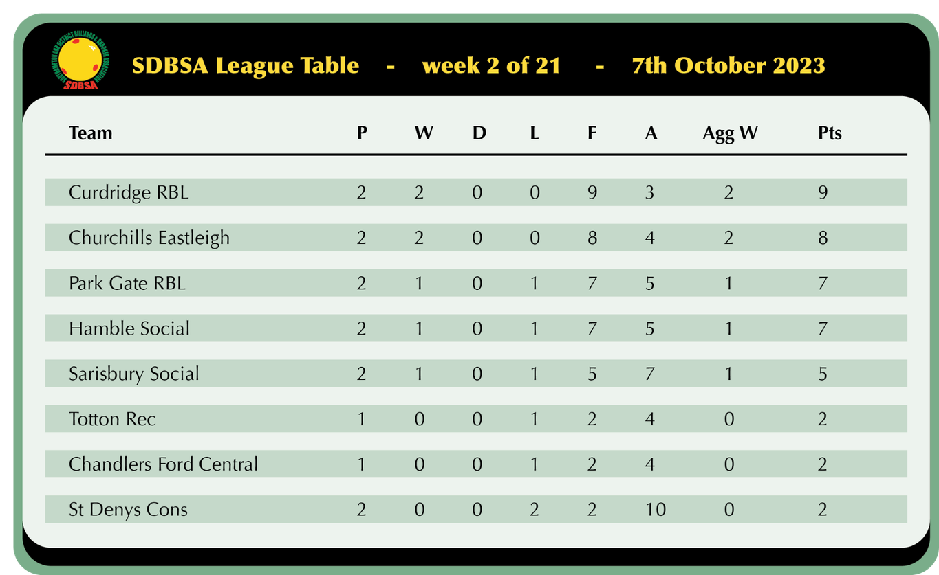 Last seasons league runners-up and Usher Shield winners Curdridge started this campaign well with a 4-2 away win at Totton Rec. The match could have swung either way early on with the first 3 games on the card being separated by a total of just 12 points! Mike Thatcher narrowly missed out by 7 points to Clive Gamblin but Mick Kunzi (32 break) levelled for the home side by 200-196, away captain Brian Bull came out on the right side of 200-199 result against Jason Stedman. to make it 1-2 to Curdridge. Brian Cannons rallied for the home side to grab one back but Steve Allen fell short against Derek Fry despite registering 47 and 38 breaks. Curdridge now have 3 players in the top 8 of the SDBSA player rankings which is quite an achievement and shows the amazing consistency of the team.