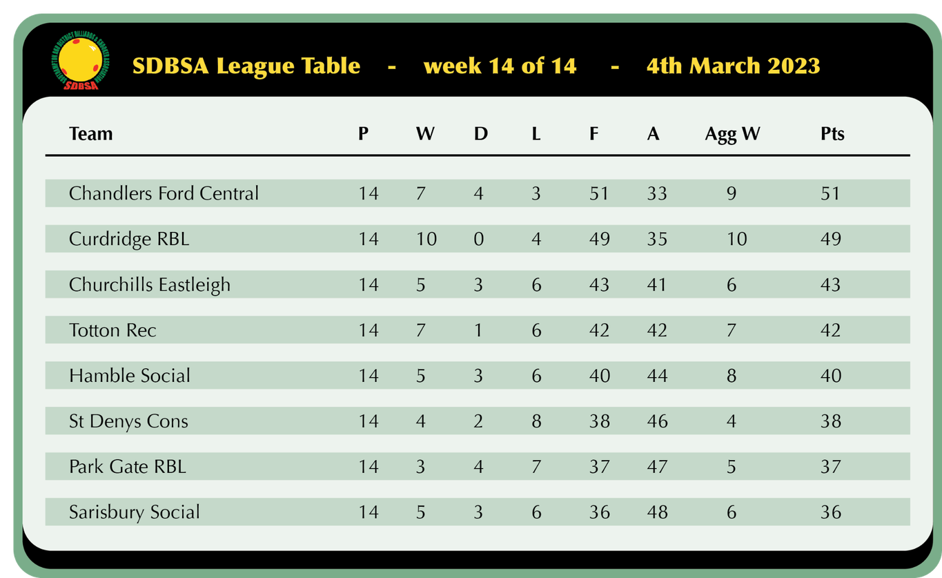 Curdridge RBL claimed runners-up spot, four points behind Hamble, after they thrashed visiting Chandlers Ford Central 5-1, condemning the 2017 champions to bottom place. Winning for Curdridge were Derek Fry over Dean Turner 200-158, Nick Alford against Daniel Zagaroli (77 and 59 breaks) 200-142, Richard Marshall over Korbin Lowe 200-154 and Brian Bull against Terry Azor (63 and 63 breaks) 200-128. Chandler’s win came in the second pairing with 'retiring' Graham Hollick beating Rob Smith 200-176.