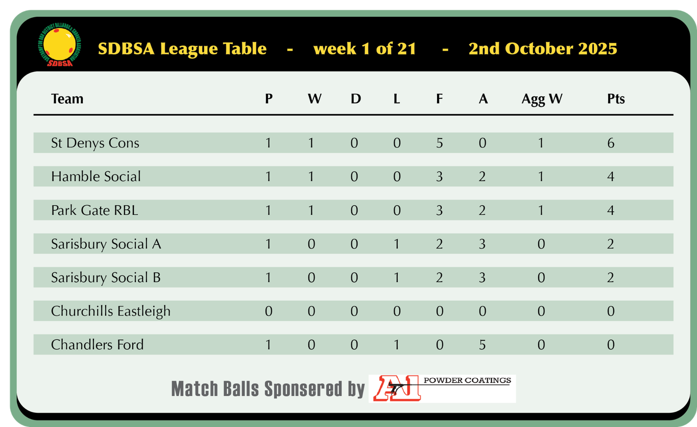 Last seasons champions St Denys B joined forces with Hamble Social and enjoyed victory in the first game for this seasons edition of the Southampton billiards league, it started well with Mark and Tony Spridgeon putting Hamble 2-0 up and Tony firing in a superb 30 break against Clive Gamblin, Clive later rallied with a 30 of his own but fell short by a huge 200-140 margin, Rob Smith got 1 back for Curdridge and gave some hope in the aggregate race winning by 61 points which left the ex St Denys pair Chris Bishop and Harry Yard to settle the tie, Chris had a comfortable win with breaks of 57 and 43 despite the tables slight quirks ending both breaks prematurely and Brian Bull beat Harry in the last game to narrow Curdridges deficit to 4-2