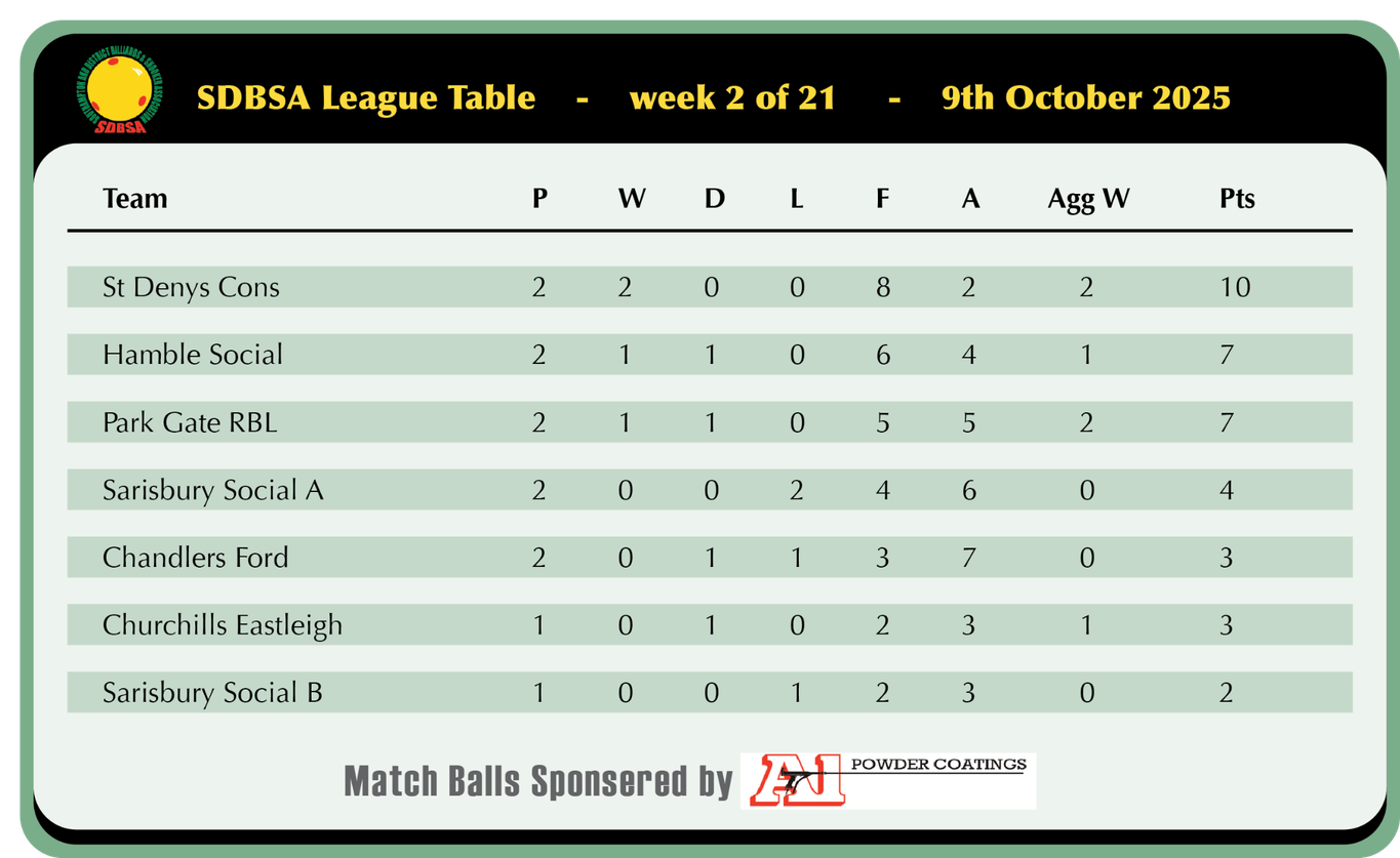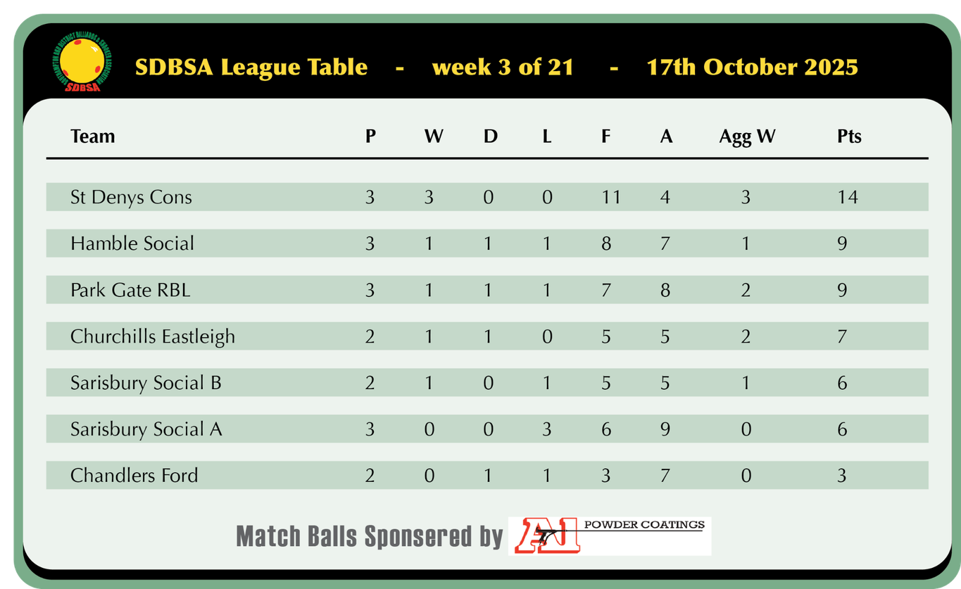 Sarisbury and Park Gate fought out a closer battle with Gary Wilton making the difference for Park with a 33 break and a 64 point win over his opponent to secure a 4-2 win, John Oldfield and Geoff Knapp both won for Sarisbury but Steve Boterhoek and Adam Humphries both backed up Gary well with victories for the away side.